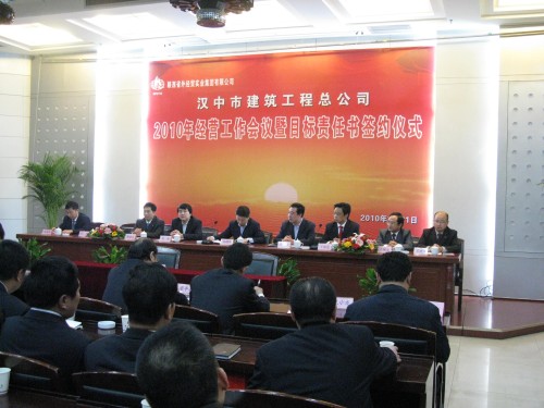 2010年3月21日,漢中市建筑工程總公司組織召開了2010年經營工作會議暨目標責任書簽約儀式,參加會議的有漢建總領導、中層干部、各項目部項目經理及技術管理骨干。陜西省外經貿實業(yè)集團董事長劉耀華、集團副總經理李鳳成、總會計師劉晏及集團公司辦公室、經營管理部、財務部、黨群部等各部門領導出席會議。