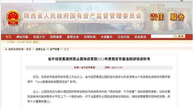 省國(guó)資委網(wǎng)站轉(zhuǎn)載:集團(tuán)所屬止園飯店榮獲2012年度西安市最佳旅游飯店稱號(hào)
