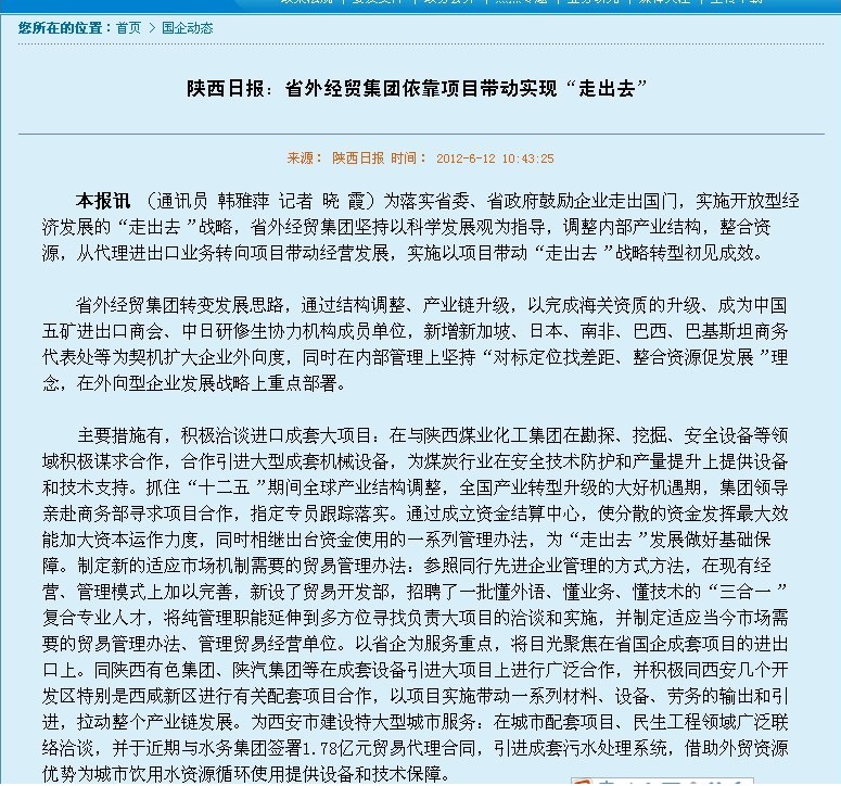 省國資委登載:陜西日報刊登省外經(jīng)貿(mào)集團(tuán)依靠項(xiàng)目帶動實(shí)現(xiàn)“走出去”