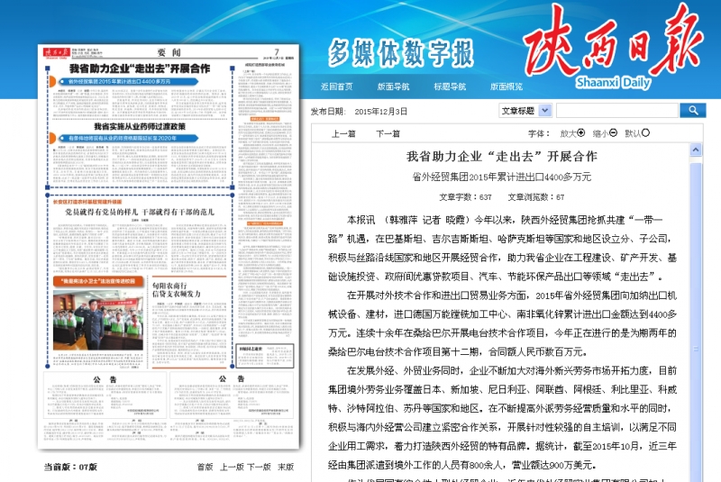 陜西日報刊登-----我省助力企業(yè)“走出去”開展合作