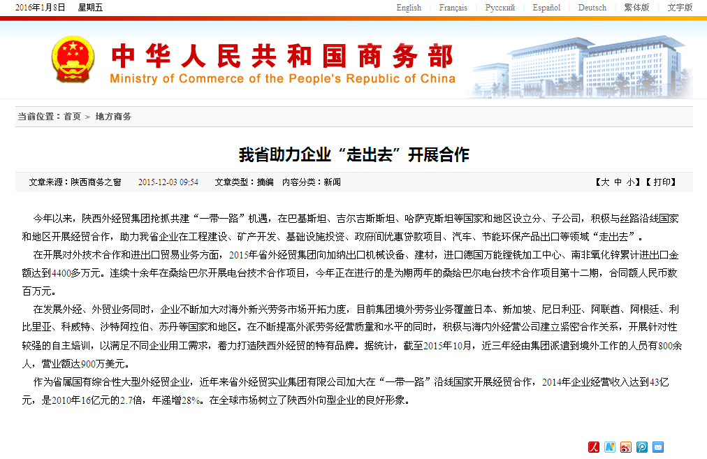 商務(wù)部網(wǎng)站刊登-----我省助力企業(yè)“走出去”開展合作