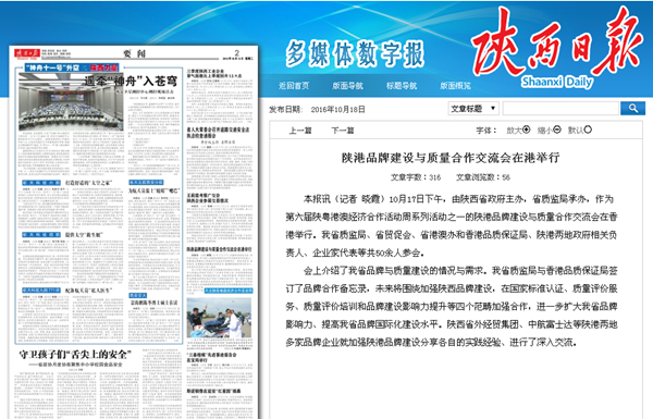 陜西日報(bào)刊登---陜港品牌建設(shè)與質(zhì)量合作交流在港舉行