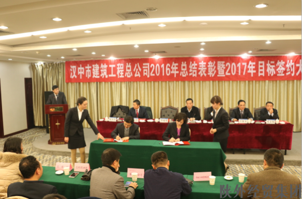 2017年1月20日,漢中市建筑工程總公司召開2016年度總結(jié)表彰暨2017年目標(biāo)簽約大會(huì)。漢建總公司領(lǐng)導(dǎo)班子成員,各職能部門負(fù)責(zé)人、成員、分公司、項(xiàng)目部負(fù)責(zé)人及成員,以及陜西晗瑞有限責(zé)任公司和漢江混凝土公司領(lǐng)導(dǎo)和同志共計(jì)110余人參加會(huì)議。陜西省外經(jīng)貿(mào)集團(tuán)公司黨委委員、副總經(jīng)理呂軍政同志蒞臨大會(huì)。