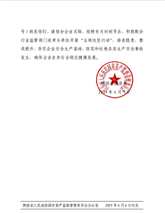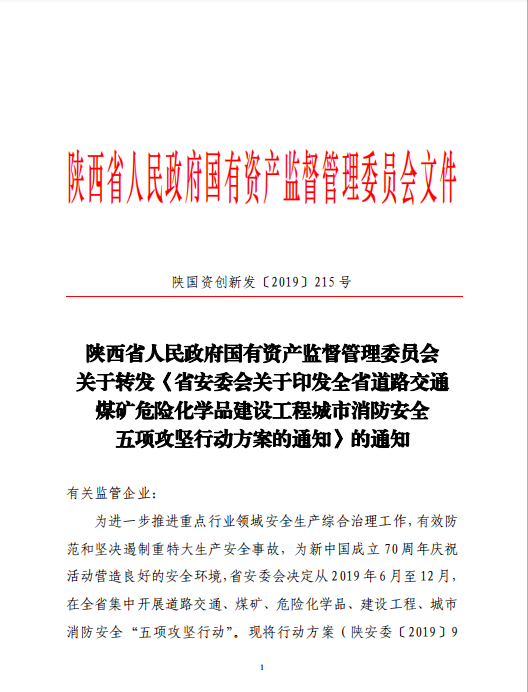 陜西省人民政府國有資產監(jiān)督管理委員會關于轉發(fā)《省安委會關于印發(fā)全省交通煤礦化學品建設工程城市消防安全五項攻堅行動方案的通知》的通知